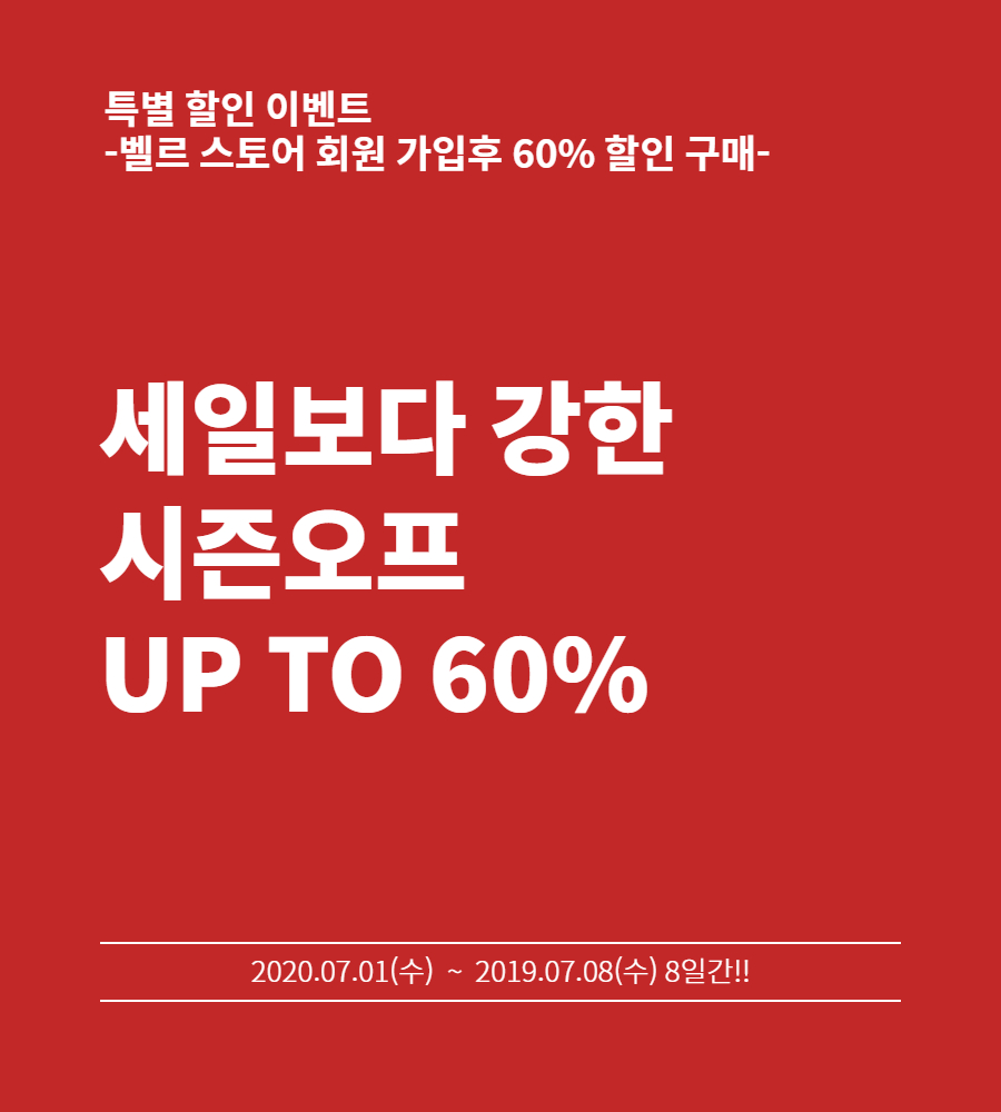 | [SALE]벨르 스토어 블랙할인 60% 행사 (0) | 2020.07.01 |